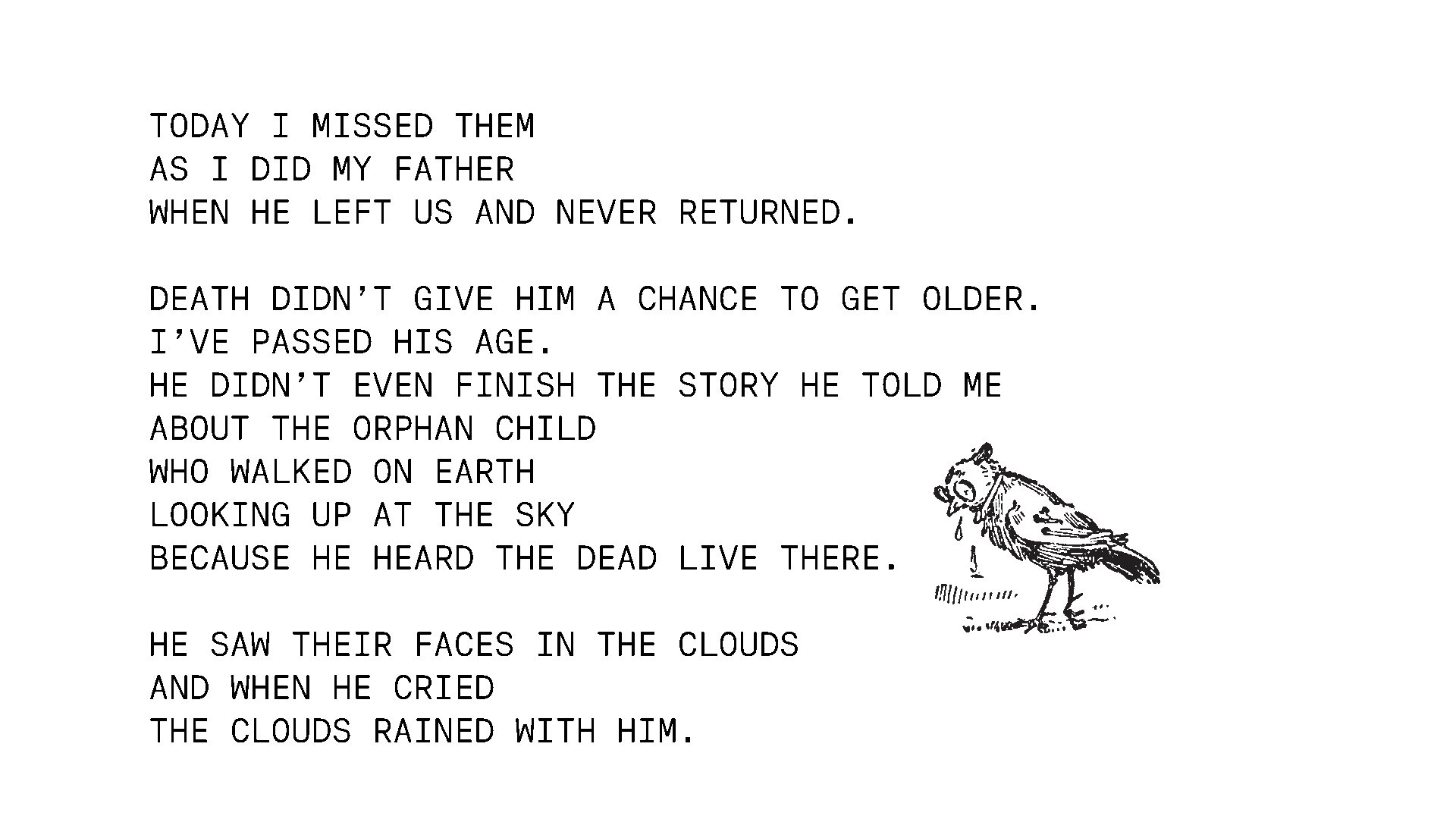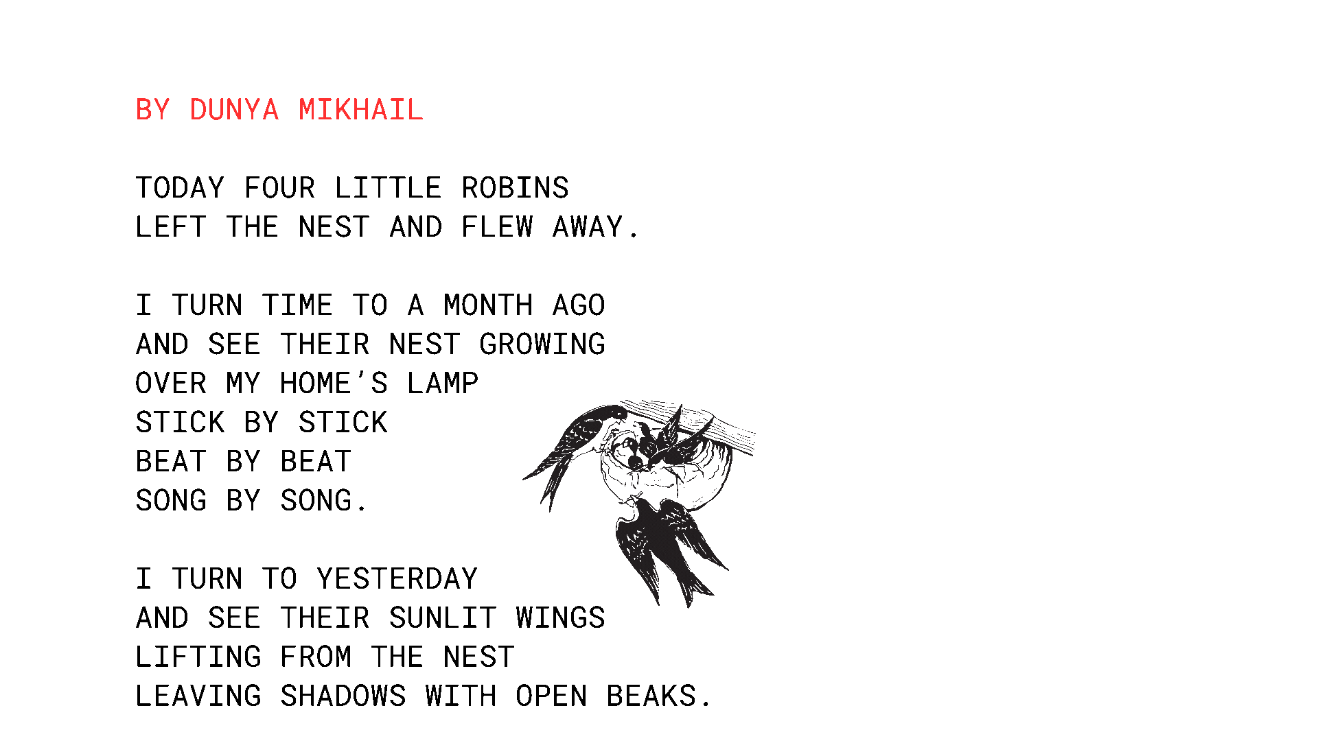 Hier ist das Original von Dunya Mikhail. Und der Prozess es zu dem wurde.
